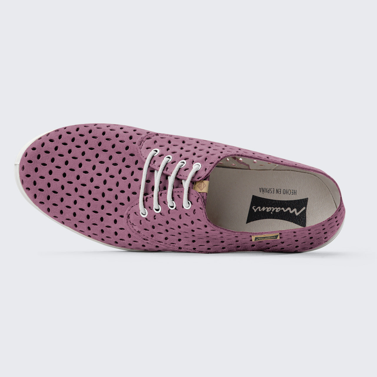 This elegant lace-up style uses locally sourced perforated suede and is vulcanized traditionally, in the authentic form with no binding or gluing and uses natural rubber NOT plastics. Hand-crafted in our family owned factory in La Rioja, Spain.